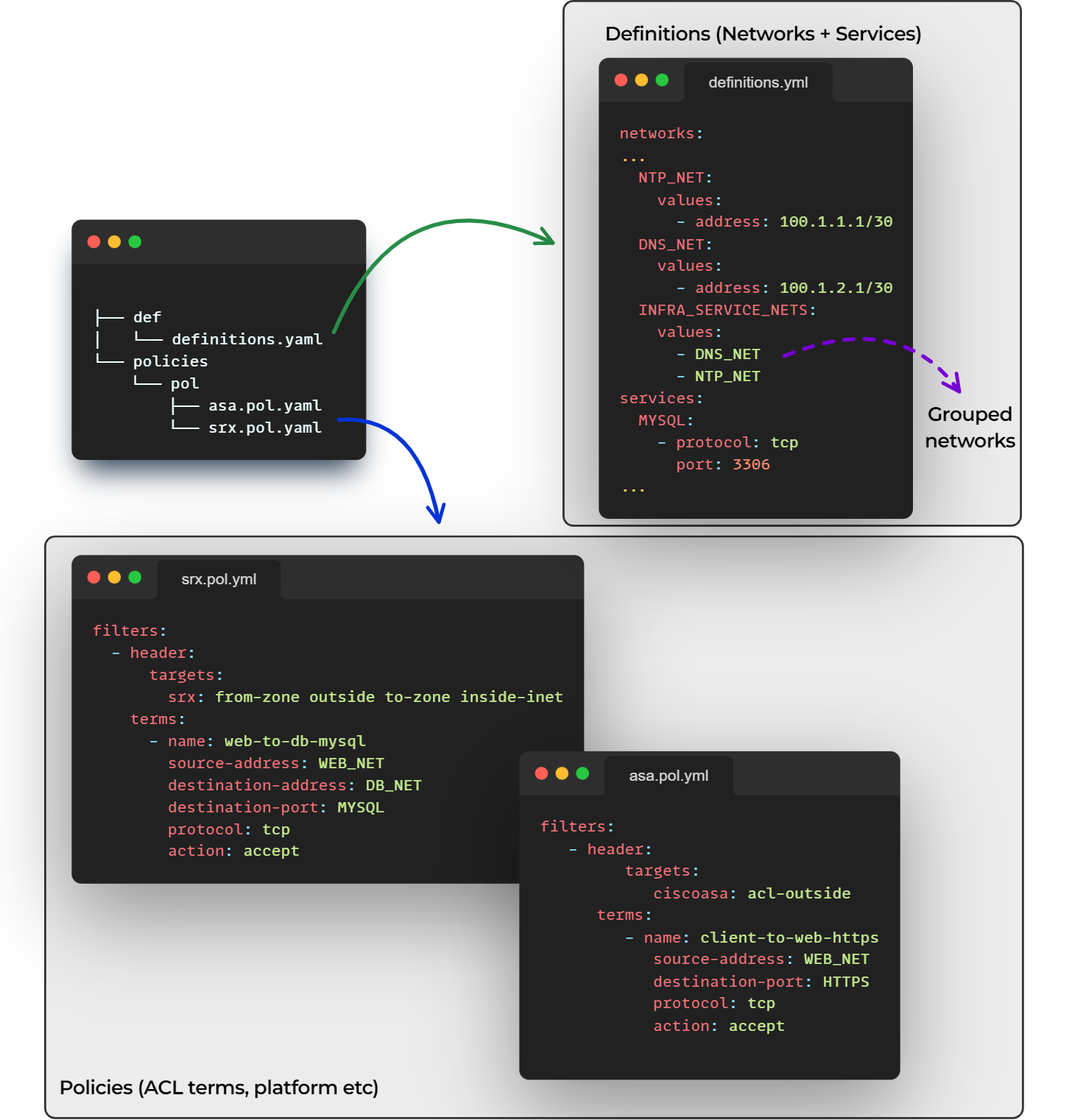 - Definition files, your different networks, and services. These are then referenced from within your policy files.