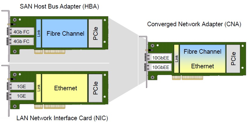 A Converged Network Adapter (CNA) is a single network interface card that contains both a Fibre Channel (FC) host bus adapter (HBA) and a TCP/IP Ethernet NIC.